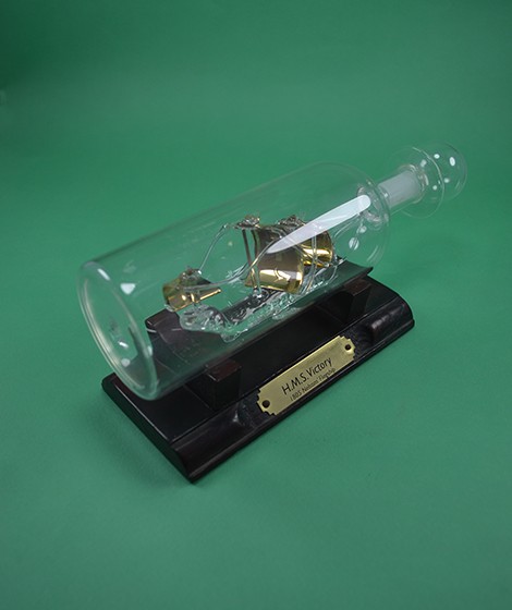 We consider artwork in the form of a closed bottle with a sailing vessel in the shape of a ship. The hull is transparent glass and the sail is golden in color, which gives an aesthetic and elegant shape
